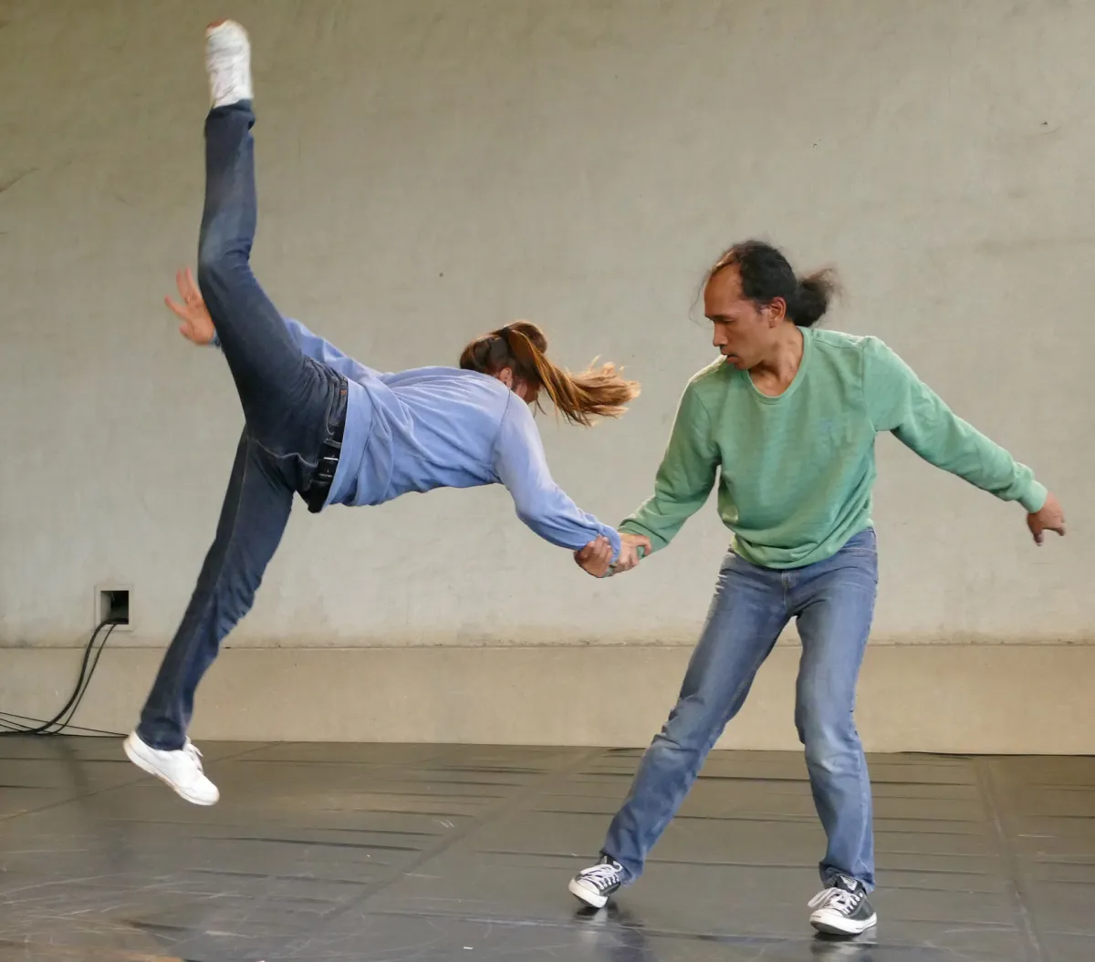 À Précy-le-Moult, dans le cadre de la quatrième édition de "Tour de danse(s)". Présentation d'étape de création. Avec la danseuse et chorégraphe Julie Gouju (Compagnie L'inesthétique) et le beatboxer Scratchy (qui pratique le krump).